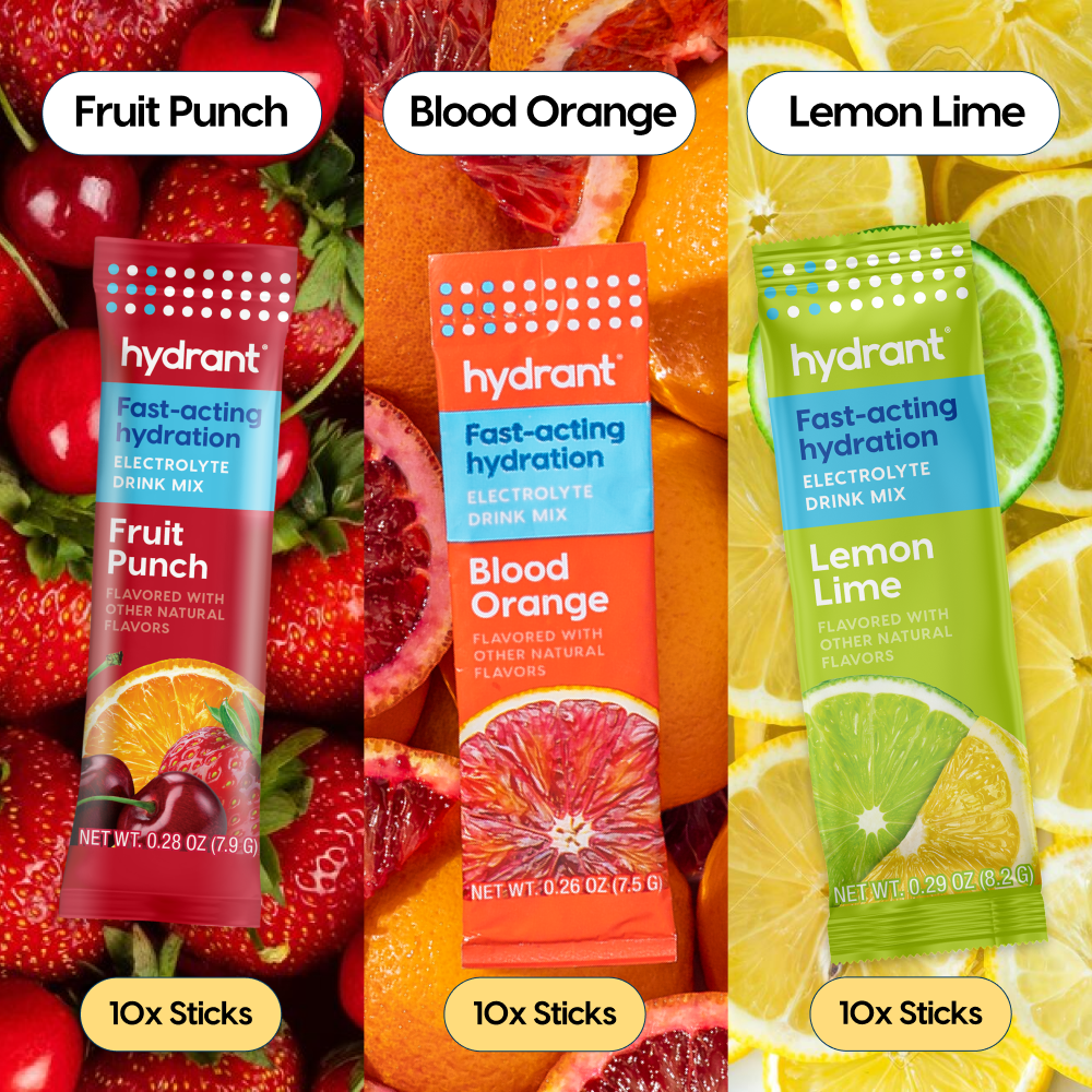 Hydrant electrolyte drink mix packaging with fruit illustrations and three flavor packets: fruit punch, lemon-lime, blood orange.