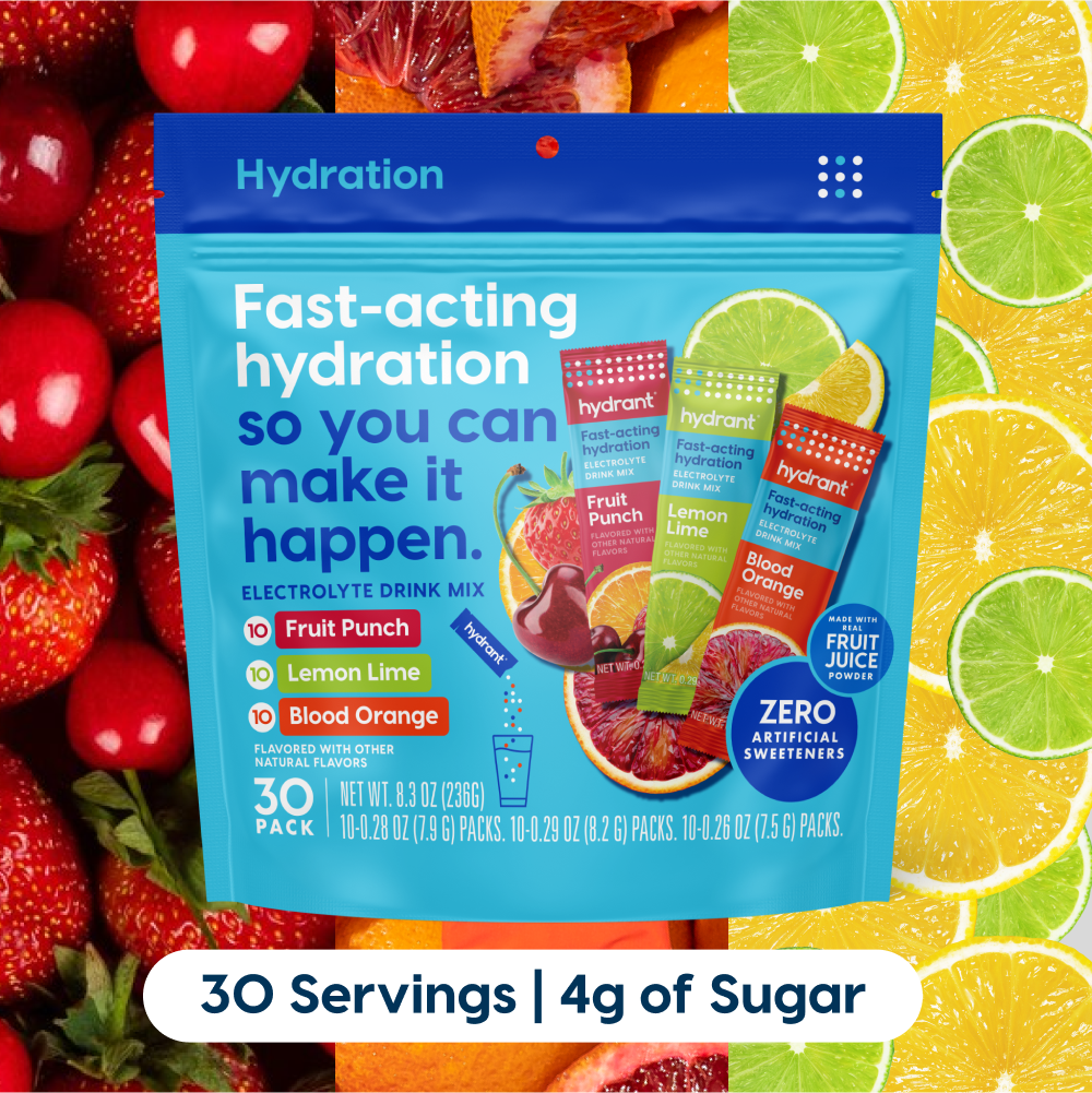 Hydrant electrolyte drink mix packet variety pack with fruit illustrations on the packaging.