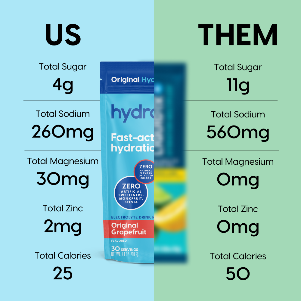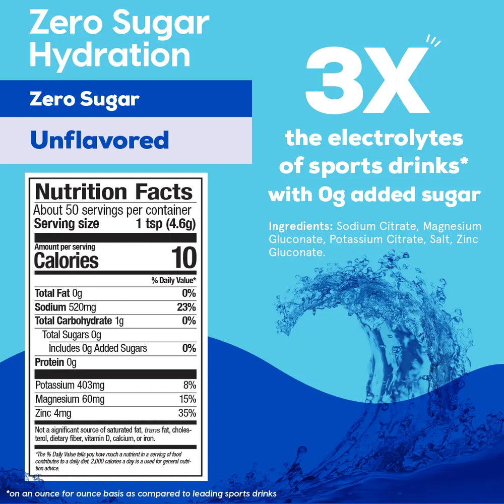 nto your bloodstream – delivering hydration 2x faster than water alone* *Based on clinical studiesYour body needs more than just water to be properly hydrated. Our key electrolytes like Sodium, Potassium, Magnesium, and Zinc help you get there.