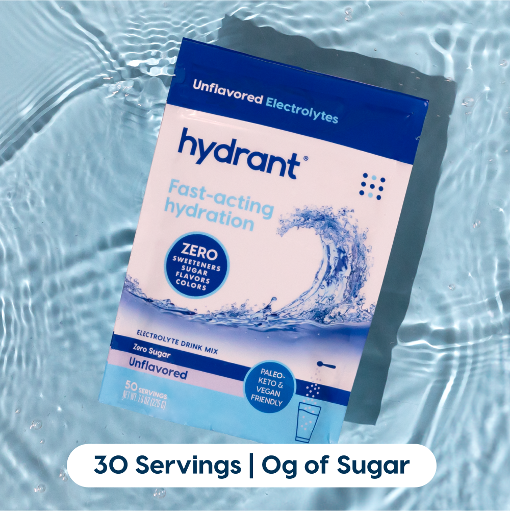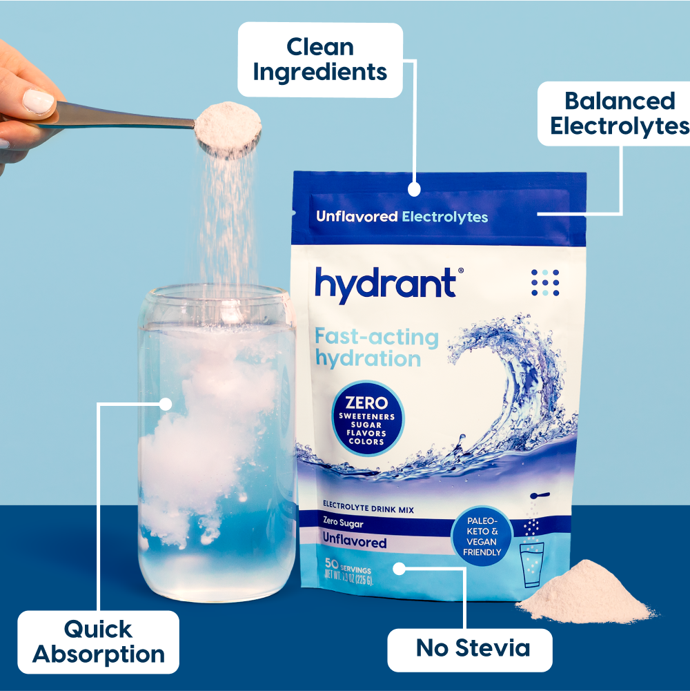 Unflavored, unsweetened electrolyte powder. 50 serving pouch with extra strong dose of Hydrant electrolytes. No stevia, no monkfruit, no sugar, no natural flavors.